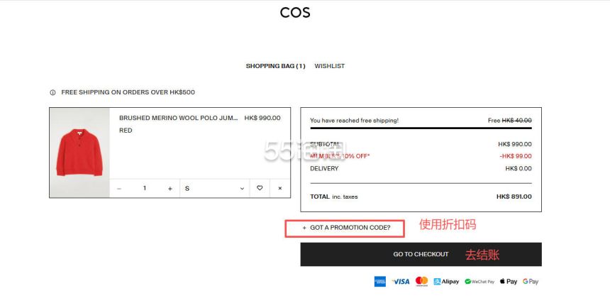 7. 确认好购物车的商品就可以去结账啦,有折扣码可以点击“GOT A PROMOTION CODE”使用,最后点击“GO TO CHECKOUT”进入结账流程。