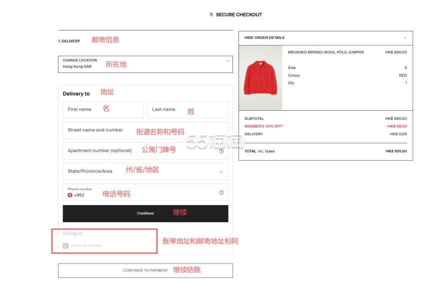 8. 首先来填写邮寄地址,网站不支持直邮中国,所以地址填写需要参考香港或澳门转运公司的地址,账单地址默认和邮寄地址相同,点击“CONTINUE TO PAYMENT”继续结账