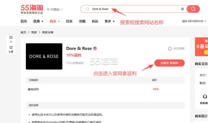 1. 注册并登录55海淘账号,不仅可以关注到国内外购物网站的优惠折扣,购物还能享受返利。本次教程以55海淘网页版为例。首先,在搜索栏搜索Dore & Rose,点击“去购买拿返利”进入Dore & Rose美国官网。