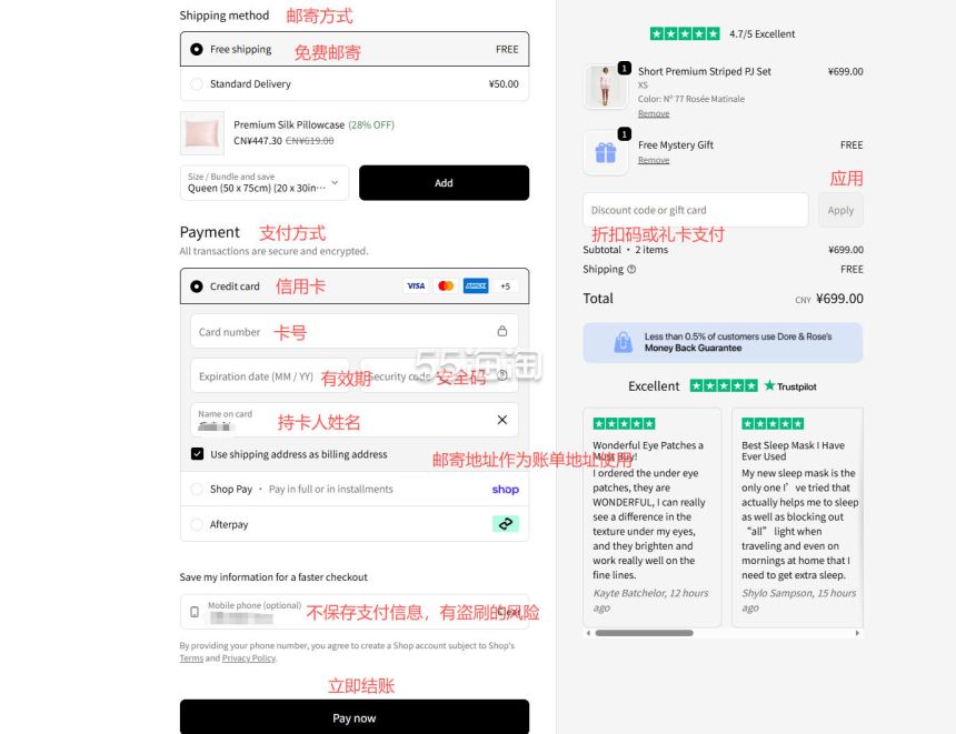 8. 邮寄方式选择免费邮寄,最后填写支付信息,选择信用卡支付的话,根据提示填写好信用卡信息,记住不要保存支付信息的选项,有卡被盗刷的风险。账单地址可勾选和邮寄地址相同,最后点击“Pay now”提交订单完成支付后,订单就生成啦。