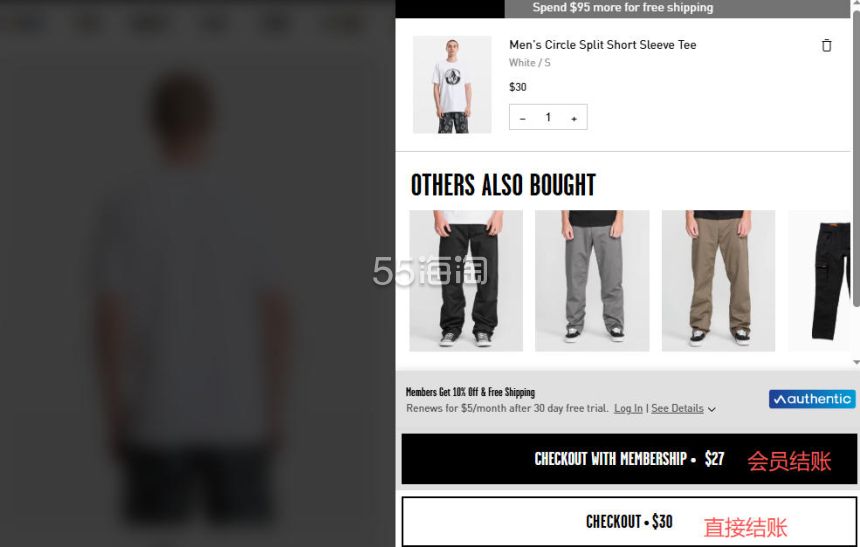 6. 成功加入购物车后会显示以下界面,可点击“CHECKOUT”结账,有网站会员可选择会员结账更划算。