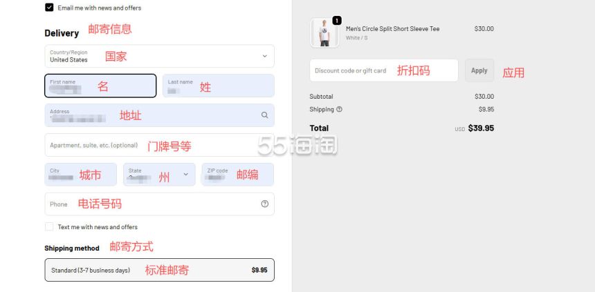 7. 首先来填写邮寄地址,网站不支持直邮中国,所以地址填写需要参考转运公司的地址,有折扣码可以添加折扣码使用,邮寄方式选择标准方式邮寄。