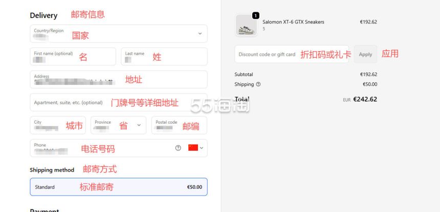 7. 首先来填写邮寄地址,网站支持直邮中国,所以地址可填写中国地址的拼音,有折扣码可以添加折扣码使用,邮寄方式选择免费的标准方式邮寄。