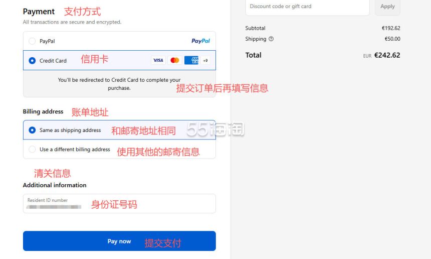 8. 接下来选择支付方式,选择信用卡支付的话直接勾选,其他信息需要提交订单后填写。网站直邮中国需要清关信息,填写好之后点击“Pay now”进行支付。