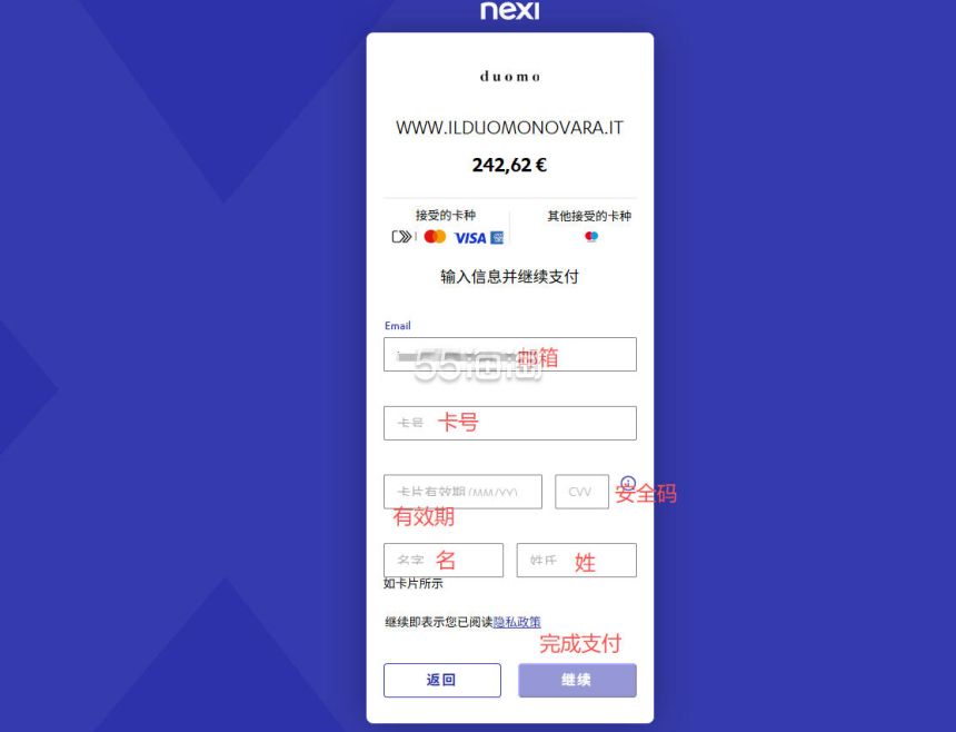 9. 接下来进行支付,可选银行卡支付,也可以选择其他支付方式,比如支付宝,选择好之后跳转到信息填写页面,根据提示完成填写后,点击“继续”完成支付,订单就生成啦!