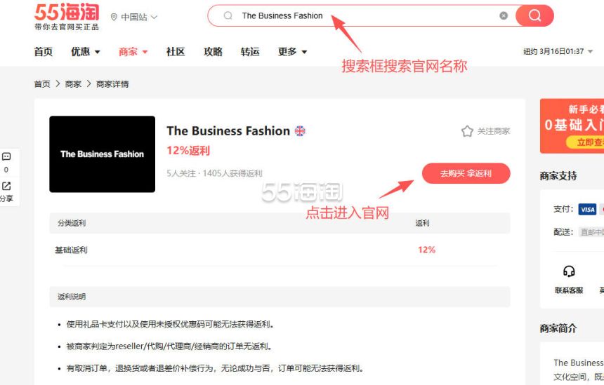 1. 注册并登录55海淘账号,不仅可以关注到国内外购物网站的优惠折扣,购物还能享受返利。本次教程以55海淘网页版为例。首先,在搜索栏搜索The Business Fashion,点击“去购买拿返利”进入The Business Fashion英国官网。