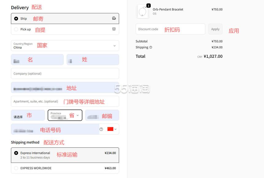 7. 首先来填写邮寄地址,网站支持直邮中国,可以填写中国地址拼音,有折扣码可以添加折扣码使用,邮寄方式选择第一个标准方式邮寄。