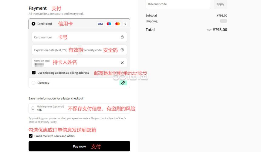 8. 最后填写支付信息,选择信用卡支付的话,根据提示填写好信用卡信息,记住不要保存支付信息的选项,有卡被盗刷的风险。账单地址可勾选和邮寄地址相同,最后点击“Pay now”提交订单完成支付后,订单就生成啦。