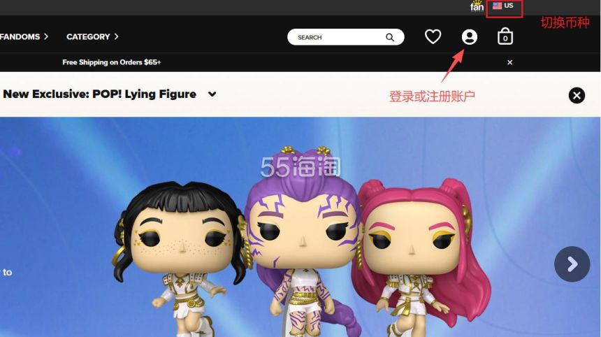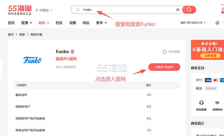 1. 注册并登录55海淘账号,不仅可以关注到国内外购物网站的优惠折扣,购物还能享受返利。本次教程以55海淘网页版为例。首先,在搜索栏搜索Funko,点击“去购买拿返利”进入Funko英国官网。
