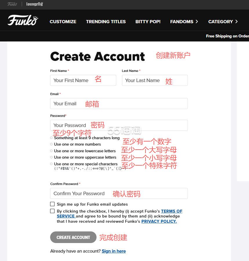 4. 现在来到创建账户的页面,根据提示填写账号信息,填写好之后点击“CREATE ACCOUNT”完成账号创建,创建完成后还需要通过去邮箱验证才可正常使用。