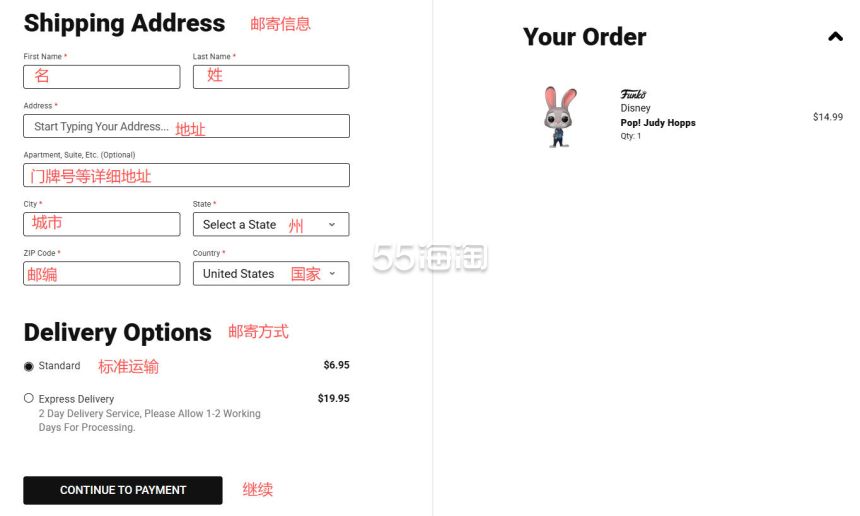 8. 首先来填写邮寄地址,网站不支持直邮中国,所以地址填写需要参考转运公司的地址,邮寄方式选择第一个标准方式邮寄,填写好之后点击“CONTINUE TO PAYMENT”继续结账。