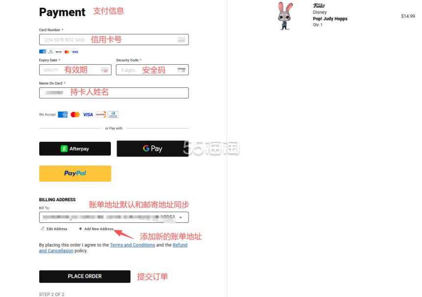 9.最后填写支付信息,选择信用卡支付的话,根据提示填写好信用卡信息。账单地址默认和邮寄地址相同,也可添加新的账单地址,最后点击“PLACE ORDER”提交订单完成支付后,订单就生成啦。