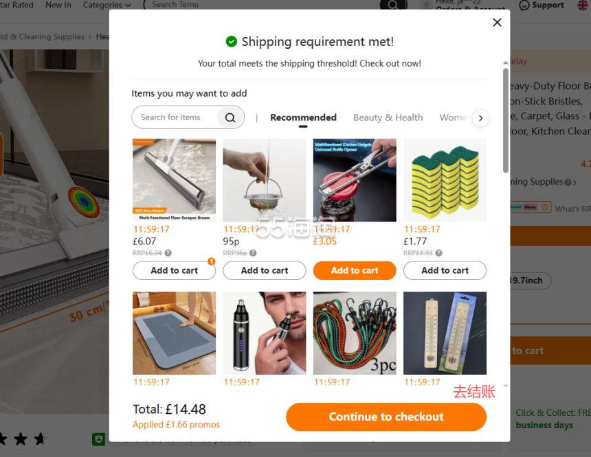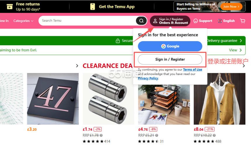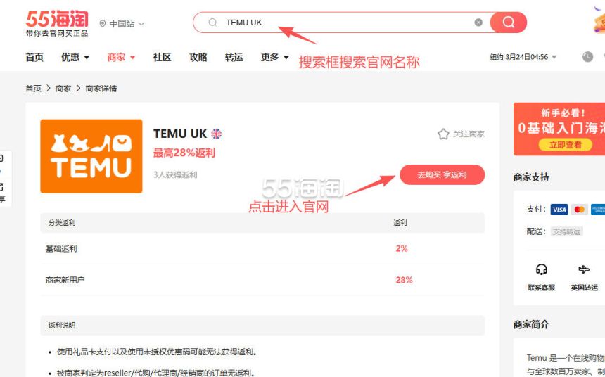 1. 注册并登录55海淘账号,不仅可以关注到国内外购物网站的优惠折扣,购物还能享受返利。本次教程以55海淘网页版为例。首先,在搜索栏搜索TEMU UK,点击“去购买拿返利”进入TEMU英国官网。