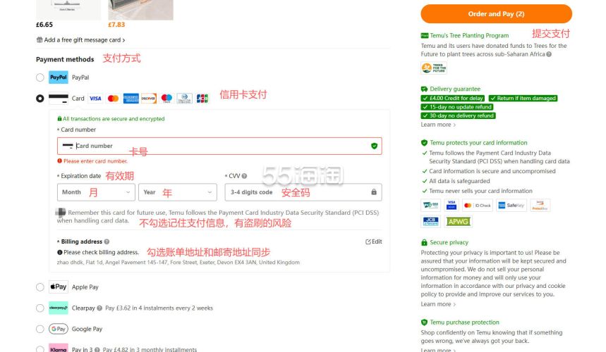 9. 最后填写支付信息,选择信用卡支付的话,根据提示填写好信用卡信息,记住不要保存支付信息的选项,有卡被盗刷的风险。账单地址可勾选和邮寄地址相同,最后点击“Order and Pay”提交订单完成支付后,订单就生成啦。