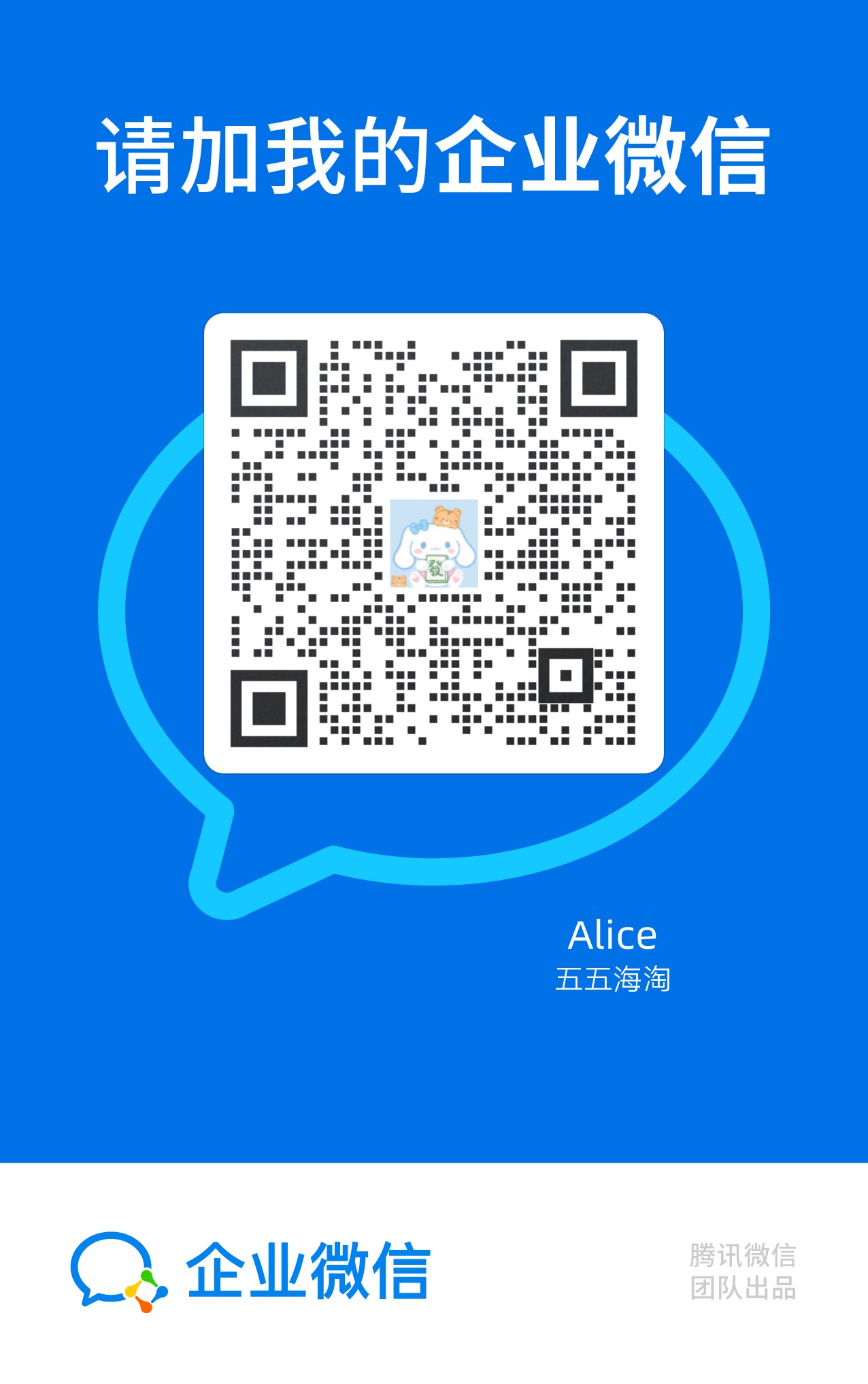 我是您的贴心小管家-Alice(已经默默关注您…好久好久啦)!为提升您的购物体验,想邀您+我企业微信,后续我将为您提供一手折扣信息,便捷的咨询渠道,个性化帮助等,期待与您在企业微信建立联系哦,风里雨里,我都在这等您….