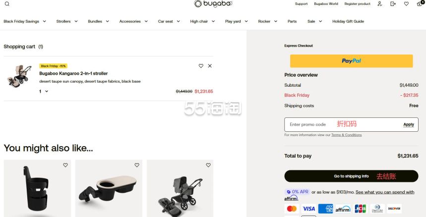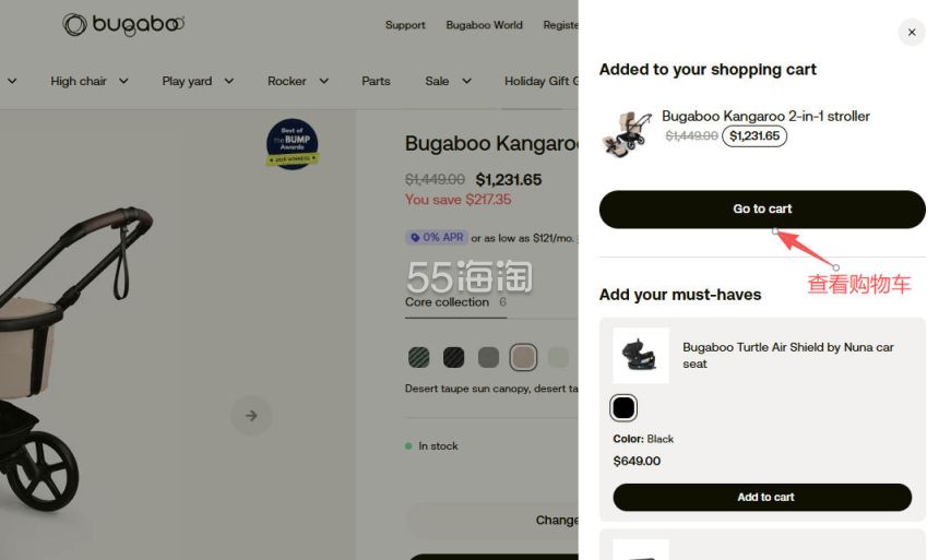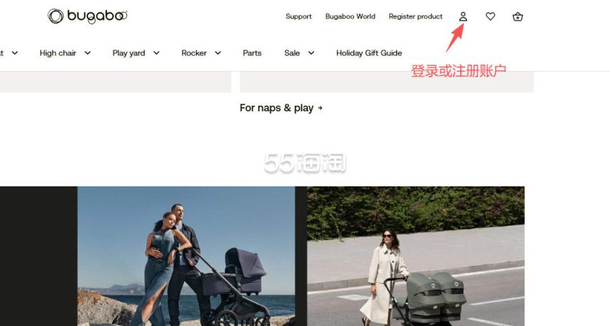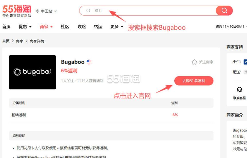 1. 注册并登录55海淘账号,不仅可以关注到国内外购物网站的优惠折扣,购物还能享受返利。本次教程以55海淘网页版为例。首先,在搜索栏搜Bugaboo,点击“去购买拿返利”进入Bugaboo美国官网。