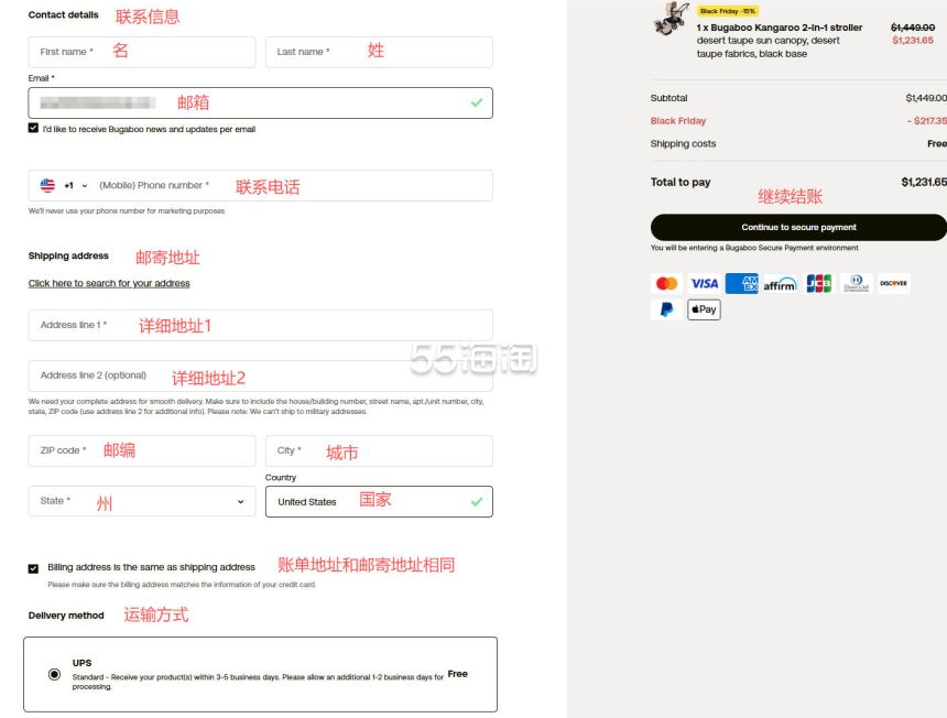 7. 首先来填写邮寄地址,网站不支持直邮中国,所以地址填写需要参考转运公司的地址,邮寄方式默认,账单地址可勾选和邮寄地址相同,填写好之后点击“Continue to payment”进入结账流程。