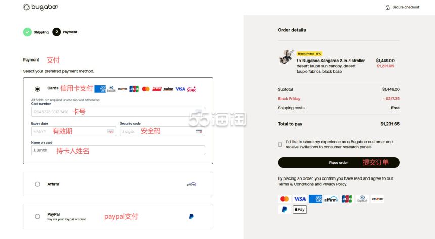 8. 最后填写支付信息,选择信用卡支付的话,根据提示填写好信用卡信息。最后点击“Place order”提交订单完成支付后,订单就生成啦。