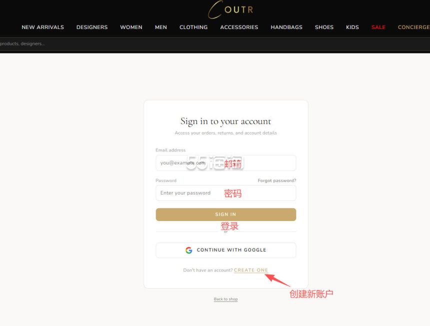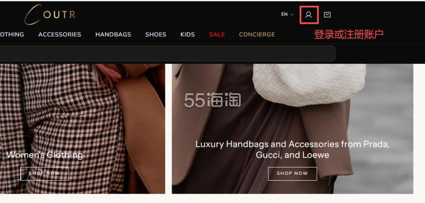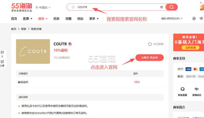 1. 注册并登录55海淘账号,不仅可以关注到国内外购物网站的优惠折扣,购物还能享受返利。本次教程以55海淘网页版为例。首先,在搜索栏搜索COUTR,点击“去购买拿返利”进入COUTR美国官网。