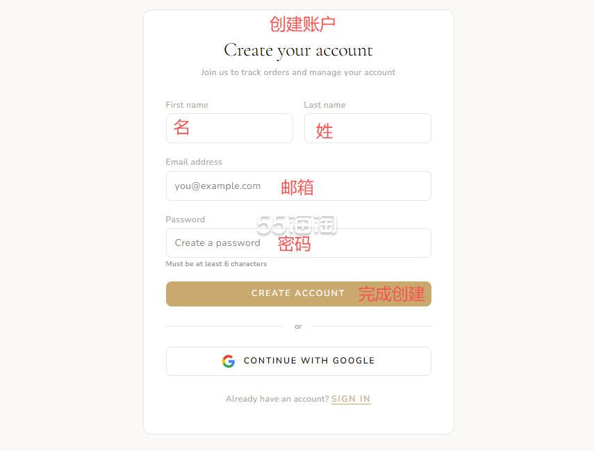 4. 现在来到创建账户的页面,根据提示填写账号信息,填写好之后点击“CREATE ACCOUNT”完成账号创建。