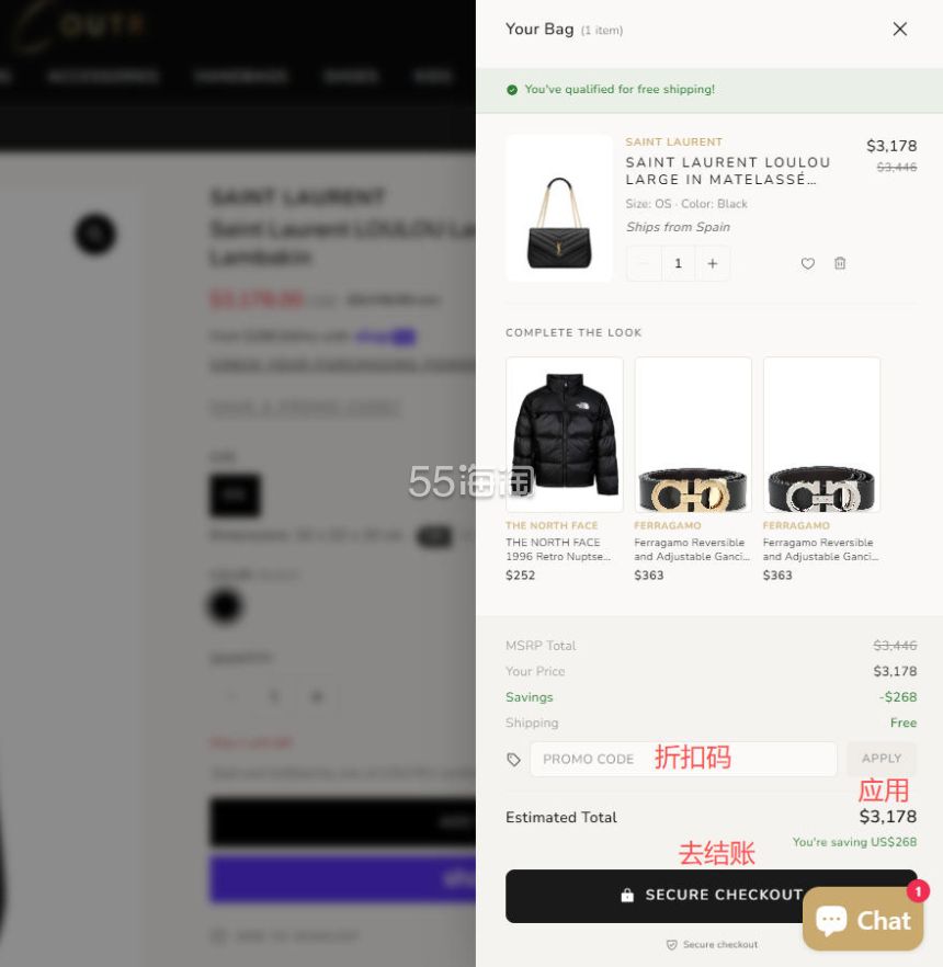 6. 成功加入购物车后会显示以下界面,可点击“SECURE CHECKOUT”进入结账流程,有折扣码可以填写折扣码享受优惠。