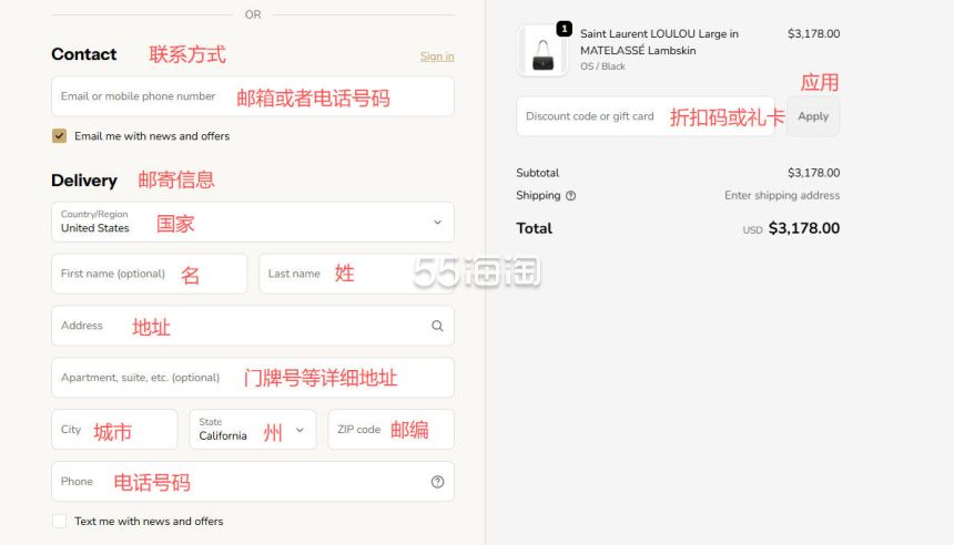 7. 首先来填写邮寄地址,网站支持直邮中国,如果转运的话需要参考转运公司的地址,有折扣码可以添加折扣码使用。