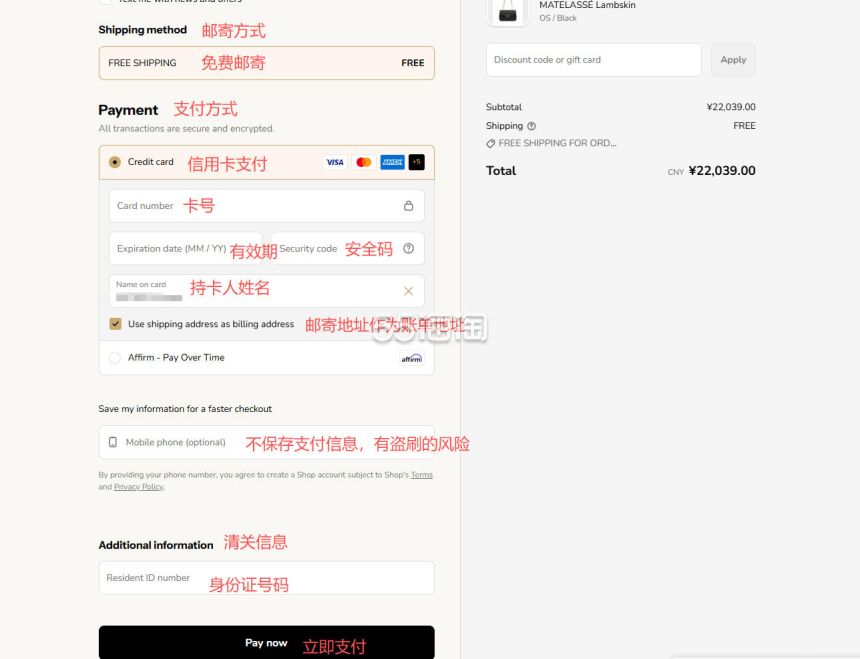 8. 邮寄方式默认,最后填写支付信息,选择信用卡支付的话,根据提示填写好信用卡信息,记住不要保存支付信息的选项,有卡被盗刷的风险。账单地址可勾选和邮寄地址相同,如果直邮需要填写身份证号码用于清关,最后点击“Pay now”提交订单完成支付后,订单就生成啦。