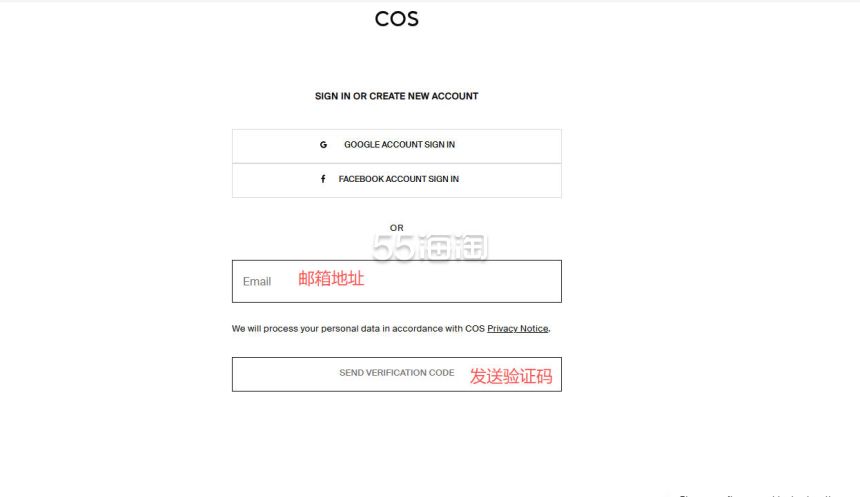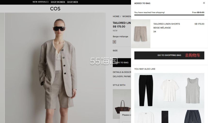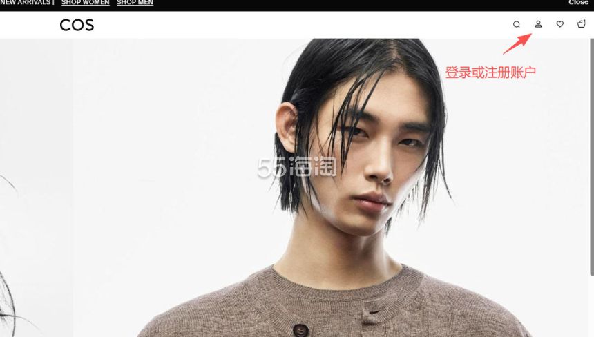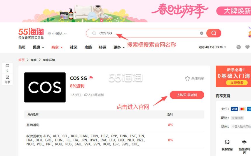 1. 注册并登录55海淘账号,不仅可以关注到国内外购物网站的优惠折扣,购物还能享受返利。本次教程以55海淘网页版为例。首先,在搜索栏搜索COS SG,点击“去购买拿返利”进入COS新加坡官网。