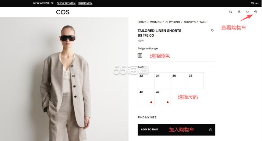 5. 账号注册好之后就可以开始购物啦,选择你想买的产品,进入到详情页,选择好之后,点击“ADD TO BAG”,右上角购物袋可查看购物车内容。