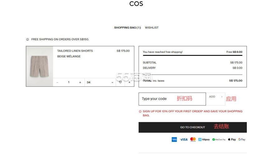 7. 进入购物车之后,有折扣码可以填写折扣码享受优惠,确认无误后点击“GO TO CHECKOUT”继续结账。