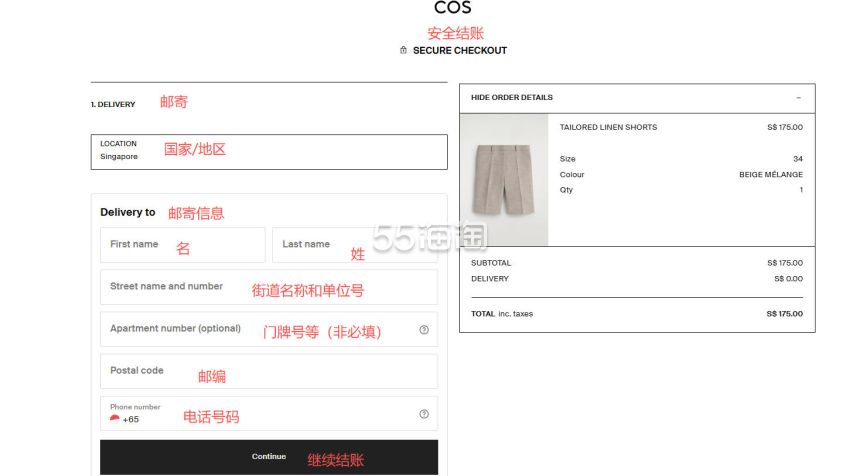 8. 首先来填写邮寄地址,网站不支持直邮中国,所以地址参考新加坡转运地址,填写好之后点击“CONTINUE”继续下一步。
