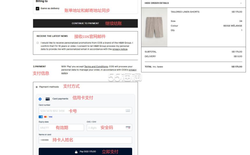 9. 账单地址可勾选和邮寄地址相同,点击“CONTINUE TO PAYMENT”继续下一步。最后填写支付信息,选择信用卡支付的话,根据提示填写好信用卡信息,,最后点击“PAY”提交订单完成支付后,订单就生成啦。